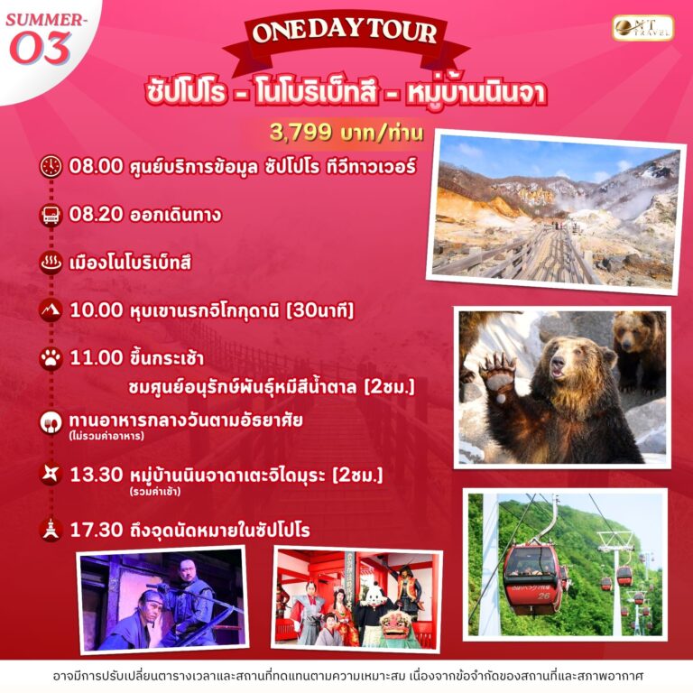 Noboribetsu Bear Park [2ชม.] ตั้งอยู่บนยอดเขาโนโบริเบ็ทสึ ของเมือง โนโบริเบทสึ ซึ่งหมีสีน้ำตาลนี้นับเป็นหมีที่มีถิ่นกำเนิดที่เกาะฮอกไกโดและที่ไซบีเรีย มาเที่ยวแถบนี้จึงไม่ควรพลาด โดยปัจจุบันหมีชนิดนี้ใช่ว่าจะพบเจอได้ง่ายตามแหล่งธรรมชาติ เพราะหมีสีน้ำตาลนั้นใกล้สูญพันธุ์และหาพบได้ยากมากๆแล้ว ภายในศูนย์อนุรักษ์ฯ จะมีพื้นที่สร้างบรรยากาศที่จำลองใกล้คล้ายคลึงกับธรรมชาติสำหรับหมีสีน้ำตาลที่อยู่อาศัยมากกว่าร้อยตัว นอกจากนั้นยังมีนิทรรศการเกี่ยวกับหมีสีน้ำตาลให้ผู้เข้าชมได้รับความรู้ ร้านอาหาร และร้านจำหน่ายของที่ระลึก