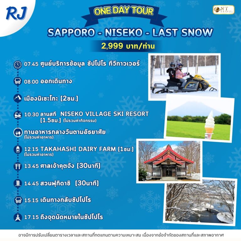 พาท่านสนุกกับ ลานสกี Niseko Village Ski Resort [ 1.30 ชั่วโมง] รีสอร์ทแห่งนี้ขึ้นชื่อเรื่องหิมะละเอียดแบบ “Champagne Powder ที่รวมกิจกรรมทางสกี หลากหลาย เหมาะกับทุกเพศทุกวัย นั่งกระเช้า Gondola (ไม่รวมค่ากระเช้า) ขึ้นไปชมวิวภูเขาโย (Mt. Yotei) ขี่สโนว์โมบิล เล่นแพหิมะ รถเลื่อนหิมะ หรืออิสระกับการถ่ายรูป วิวสวยๆ แสนโรแมนติก ภายในรีสอร์ทให้บริการครบวงจร รวมถึงมีร้านอาหารหลากหลายประเภท และร้านของหวาน คาเฟ่ต์ ร้านเสื้อผ้า (ไม่รวมค่าอาหารและกิจกรรมและอุปกรณ์สกี 15,000-35,000 เยน การเปิดของลานสกีขึ้นอยู่กับสภาพอากาศและปริมาณหิมะ ทางบริษัทขอสงวนสิทธิ์ในการปรับเปลี่ยนโปรแกรมตามความเหมาะสม)